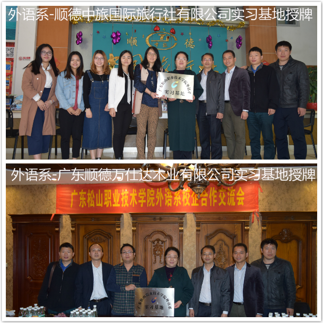 为进一步提升人才培养质量以及为学生提供更多更好的顶岗实习和就业机会,2016年12月9日至10日,广东松山职业技术学院外语系分别与顺德中旅国际旅行社有限公司和广东顺德万仕达木业有限公司举行校企合作交流会,签订了校企合作协议,并举行校外实习基地授牌仪式。会议期间,校企双方回顾和总结了前期的校企合作经验,并表示以此次交流会为契机,进一步加强校企双方在协同育人、顶岗实习、毕业生就业、资源共享、师资培训等方面的合作。