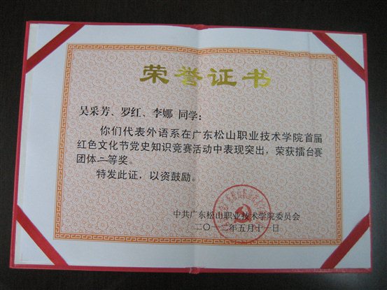 外语系代表队获学院党史知识擂台赛二等奖 发布日期:2012年05月11日 00:00 访问量:次 外语系代表队获学院2012年党史知识擂台赛二等奖 上一条:外语系开展安全知识学习竞赛活动 下一条:外语系2012外语风采大赛圆满落幕 【关闭】