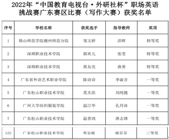 近日,由中国教育电视台指导,广东省职业技术教育学会主办,广东省外语艺术职业学院承办,外语教学与研究出版社、北京外研在线数字科技有限公司、北京外国语大学外研培训中心合办的2022年“中国教育电视台·外研社杯”职场英语挑战赛广东赛区比赛圆满落幕。外语商务学院选派的莫丕浩(指导教师:刘纯懿)、温晋鸿(指导教师:唐志锋)、邓安妮(指导教师:谢芬芬)等三位选手在写作大赛赛事中,与来自全省各个高职院校的近200名参赛选手同场竞技并脱颖而出,莫丕浩、温晋鸿两位同学斩获本次比赛“一等奖”,邓安妮同学荣获“三等奖”。