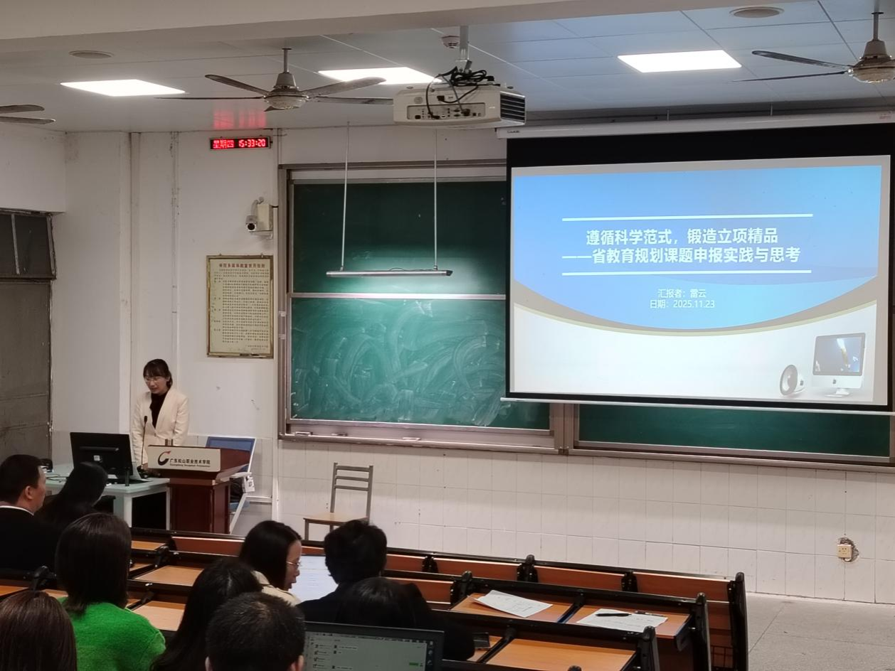 雷云老师以“遵循科学范式,锻造立项精品”为题,结合其成功申报2025年广东省教育科学规划课题(高等教育专项)的实践经验,围绕“好选题的炼成”与“好论证的设计”展开系统分享。她指出,选题应立足“顶天立地”原则,既要对接国家战略与政策导向,也要扎根教学实际,做到“真存在、有价值、我能做”。雷云以“28天与3天跨境电商人才培养速度差距”等现实问题为例,生动阐释了从现象观察到问题提炼的完整思路,并分享了批判性文献综述、研究方法链设计与微观创新表达等实用策略,为教师申报课题提供了具象参考。